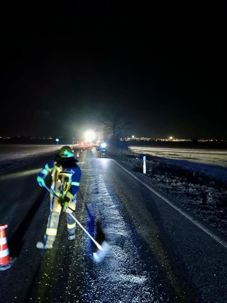 Durch uns wurde als erste Maßnahme die Einsatzstelle abgesichert und ausgeleuchtet sowie der direkte Ölaustritt am LKW eingegrenzt. Im weiteren Verlauf wurde die Ölspur auf der gesamten Strecke gebunden. Hierbei unterstützte uns die Feuerwehr Moosthenning.