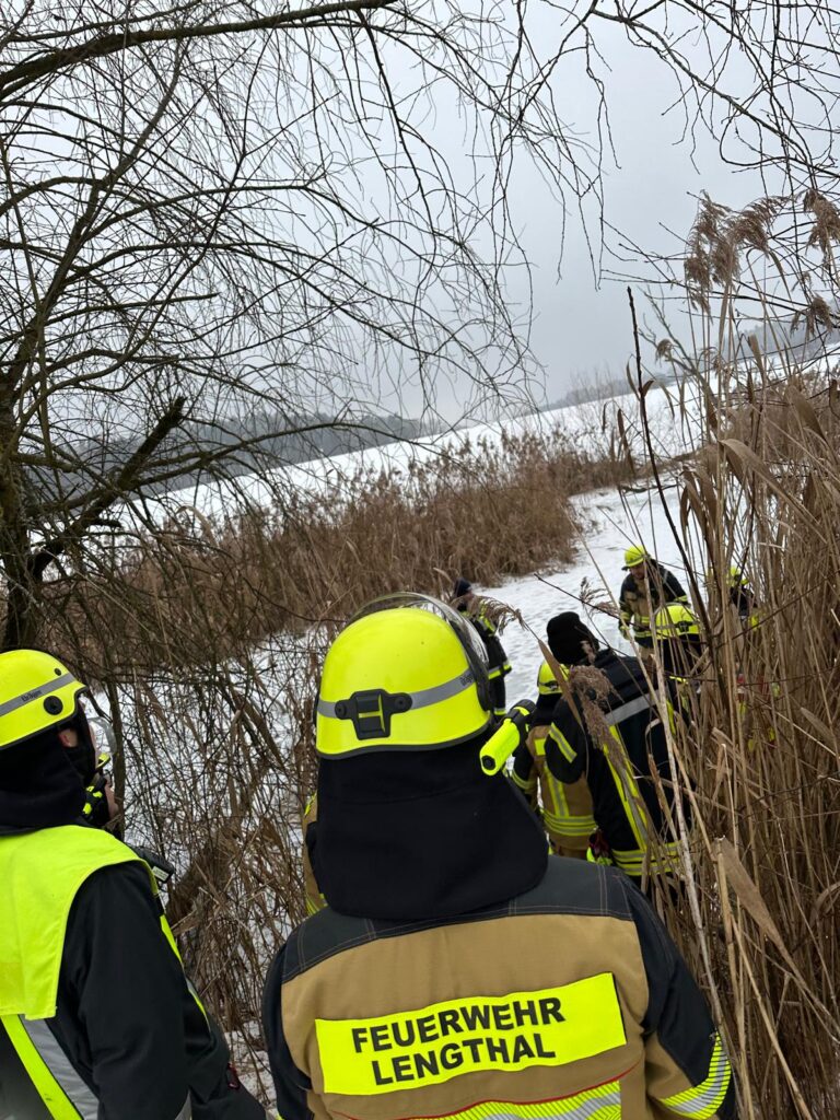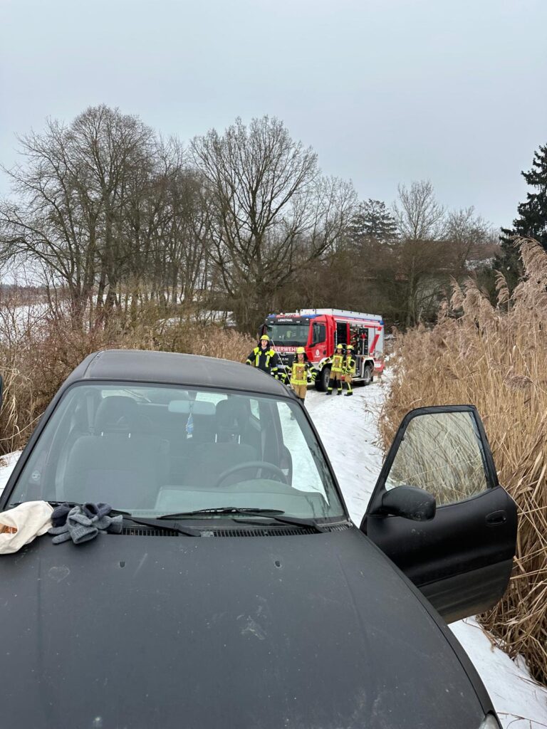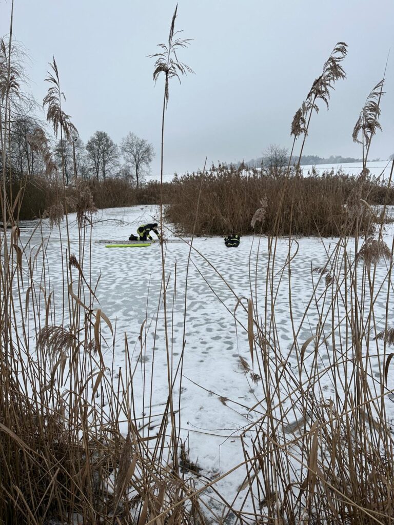 Bei Eintreffen der Einsatzkräfte wurde ein fahrerloser PKW festgestellt, der drohte, in einen Weiher abzurutschen. Das Fahrzeug wurde gegen ein weiteres Abrutschen gesichert. Gleichzeitig wurde angenommen, dass eine Person in den zugefrorenen Weiher eingebrochen war. Die Person wurde mithilfe von Steckleitern und eines Spineboards aus dem Weiher gerettet, an das Ufer verbracht und dort versorgt.